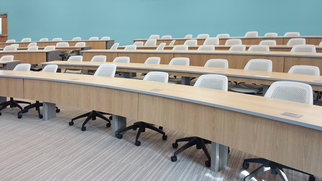 With two base options, curved and straight table top shapes, and three modesty panel selections, your choices for lecture halls are far from fixed. The Circular Base offers hardwired power and data with cord management under the work surface and down the legs. An optional form-fitted powder coated cover can match or contrast to add style to the standard plastic base. The Boat Base has a robust technology raceway inside the leg, where power and data cords can be connected to the floor monument without exiting the table base.