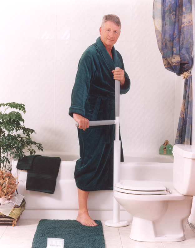 A floor mounted pivoting and locking horizontal rail. Excellent where ceiling restrictions prevent a floor to ceiling pole. Perfect beside a toilet, bath, bed, or chair.